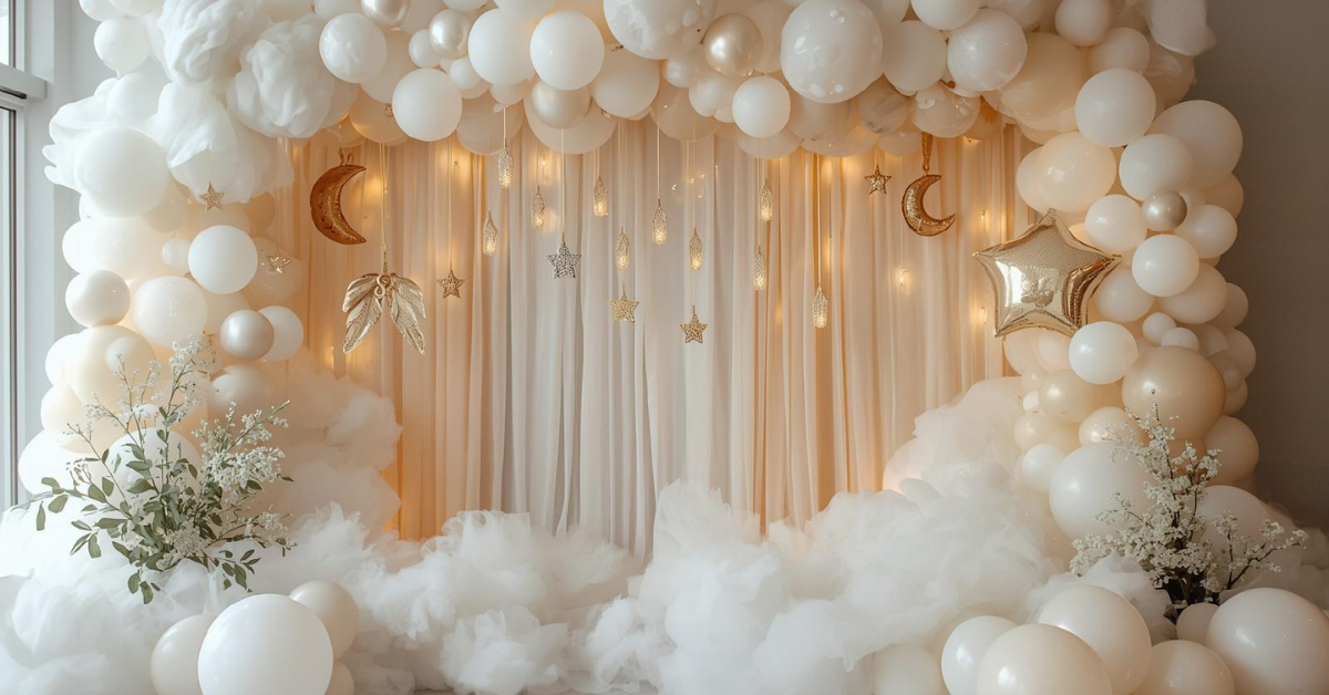 Heaven baby shower decorations focus on simplicity and softness. Neutral colours and light textures keep the space feeling peaceful and welcoming.